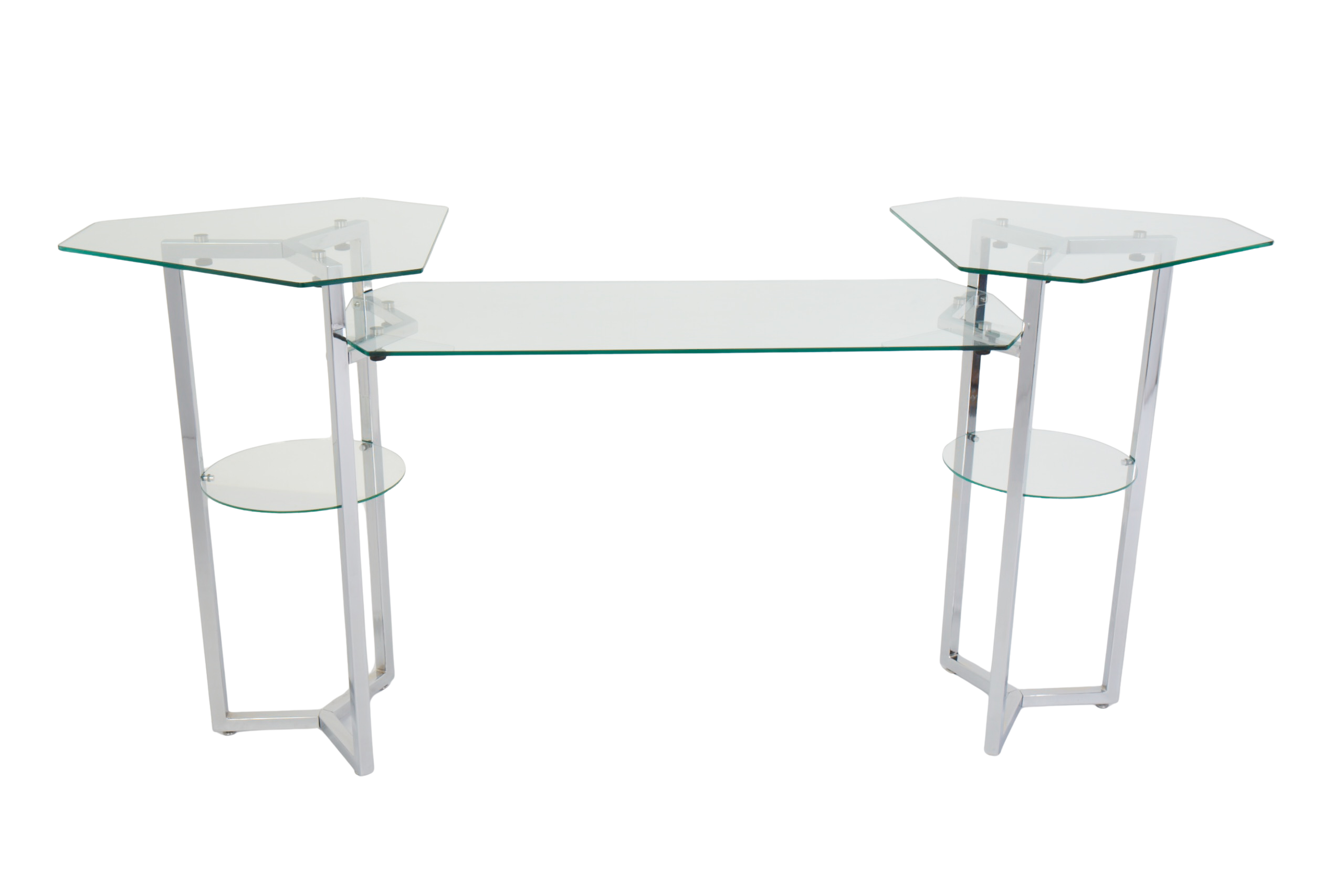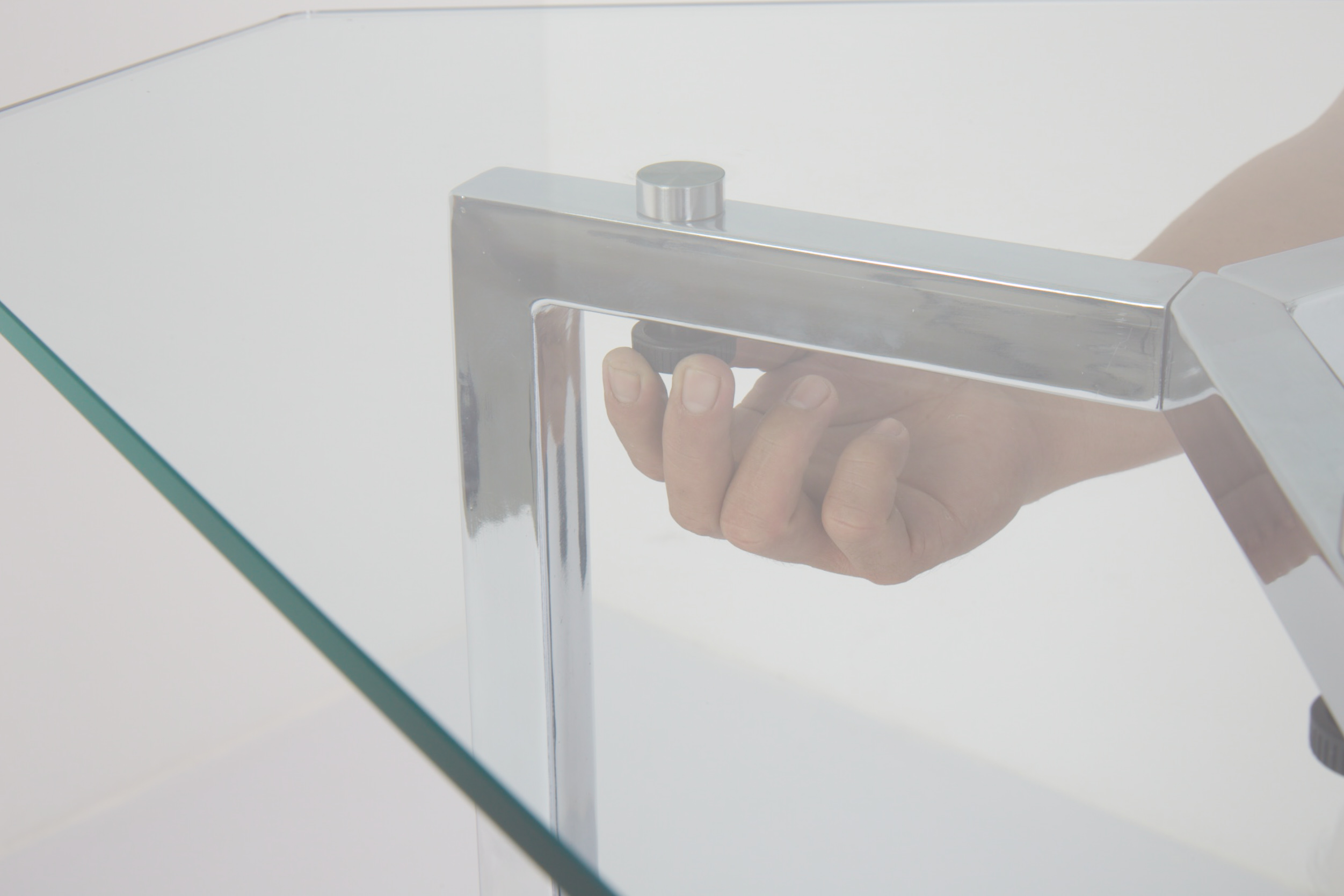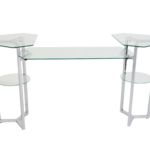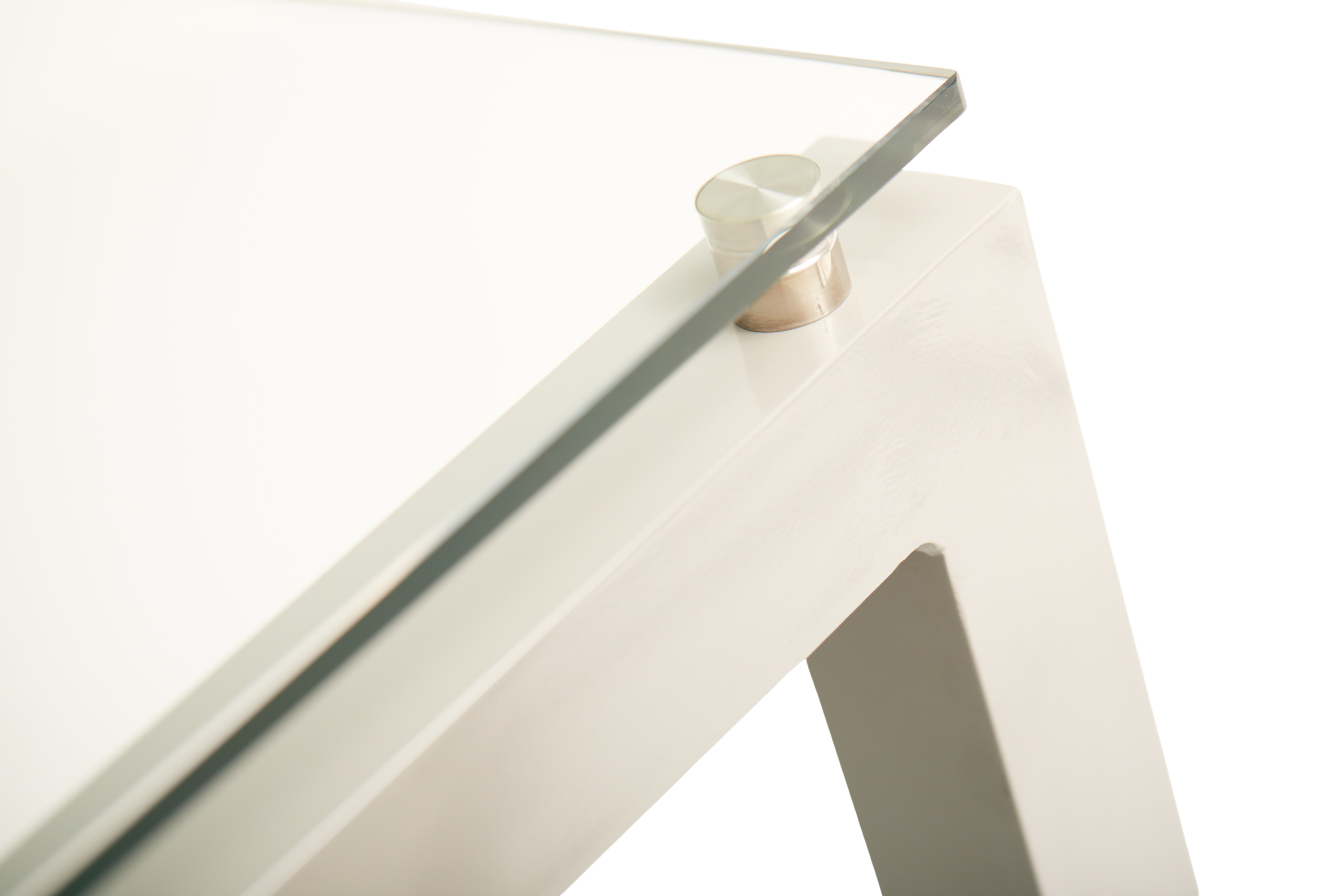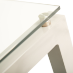 30x30mm MS square tube profile, powder coated in RAL 9006 (silver-like) finish, and a features a 10mm thick tempered clear glass tabletop.
