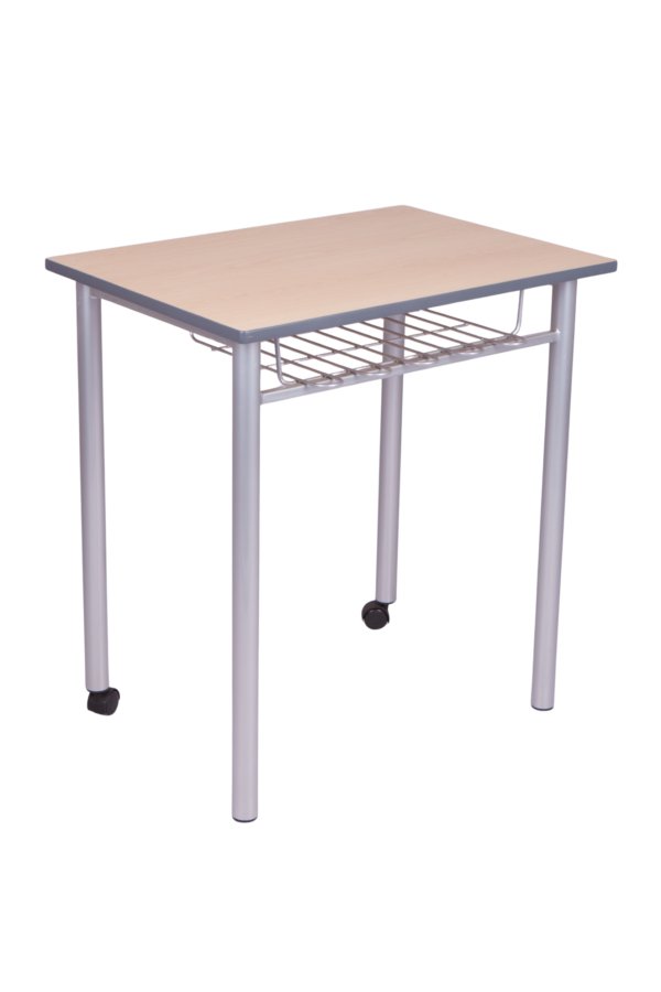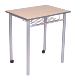 38mm dia round MS tube powder coated in RAL 9006 with 2 brake wheels in front. 18mm MDF melamine with PVC edge table top. Includes mesh tray under the table top.