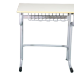 25mm dia round MS tube powder coated with 18mm MDF melamine in PVC edging. Includes mesh tray & hook under the table.